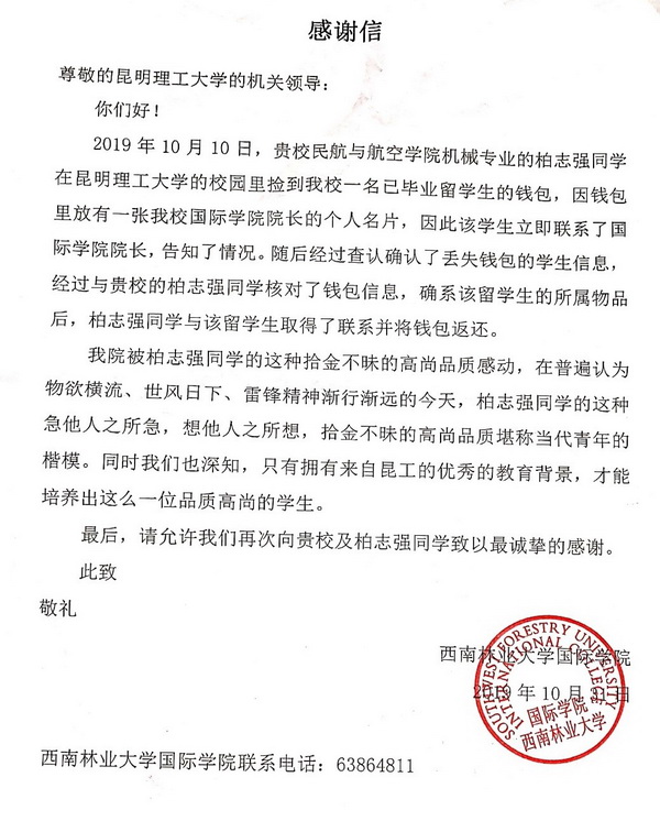拾金不昧是中华民族的传统美德,是高尚道德情操的体现,也是党员践行初心使命的具体体现。近日,国产A片 收到来自西南林业大学国际学院的一封《感谢信》,信中大力称赞2016级学生柏志强拾金不昧的高尚品质。