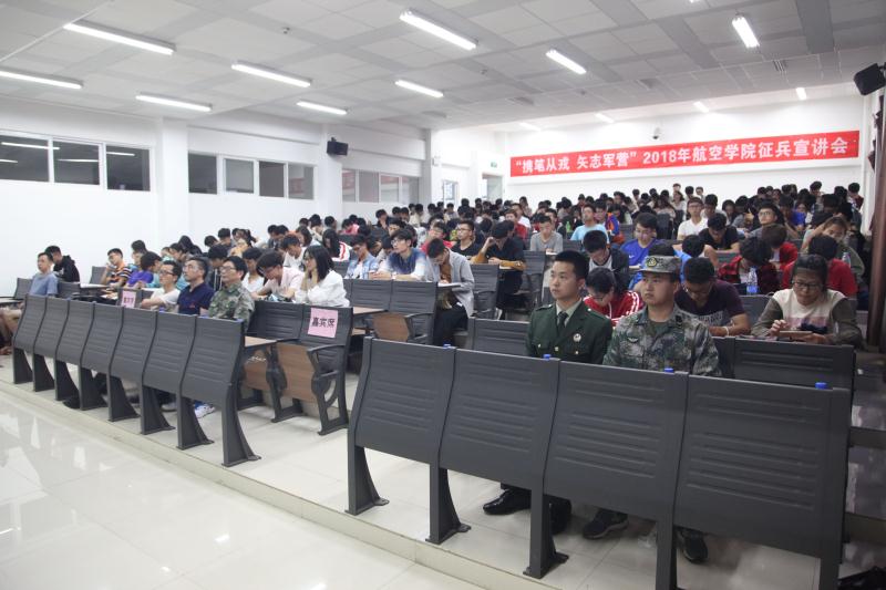 为鼓励学生积极参与应征入伍,提高兵员征集质量,推进国防和军队现代化建设,航空学院于5月23日晚在公教楼344报告厅隆重举行2018年“携笔从戎、矢志军营”征兵宣讲会。航空学院直属党支部李振山书记、朱兴东副书记出席了本次宣讲会,参加本次宣讲会的还有学院团委书记杨晶晶老师、各班班主任以及200余名同学。