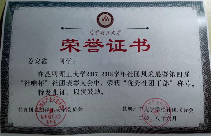 大会的伊始,校团委钟金栋书记为晚会致辞,指出社团活动要跟随党的步伐,希望各个社团能为了美好校园文化而奋斗,对这一学年来各家社团的工作给予了充分的肯定。之后由各家社团进行汇报表演,最后大会对优秀社团及优秀社团干部进行表彰。我院模拟飞行爱好者协会会长姜安鑫荣获"优秀社团干部"称号。