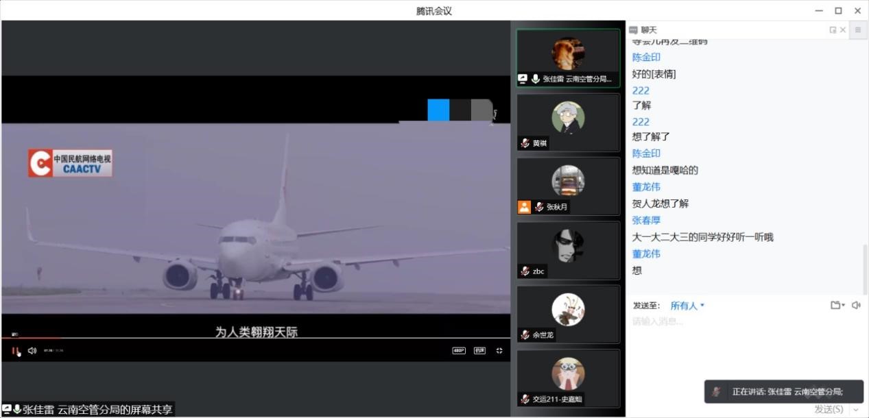 讲座中,2016级优秀校友李超(四川航空股份有限公司机务维修员)、廖传睿(七彩云南通用航空有限责任公司运行控制员),2017级优秀校友张家雷(民航云南空管分局技术保障部航管雷达室技术员)、邓天露(成都远翥航空科技有限公司航行服务分析和设计)分别结合自身所学专业及现就职岗位从工作内容、薪资待遇、面试技巧以及大学学习经验等方面做了分享交流,并对理想与现实、工作职责与使命感与学弟学妹们进行了线上讨论。参与的同学热情高涨,积极踊跃地向学长、学姐进行请教,对自己未来的职业规划有了进一步的认识和理解;参与分享的优秀校友对提出的问题进行了耐心细致的解答,感受到了校园的热情和后来者的追赶。