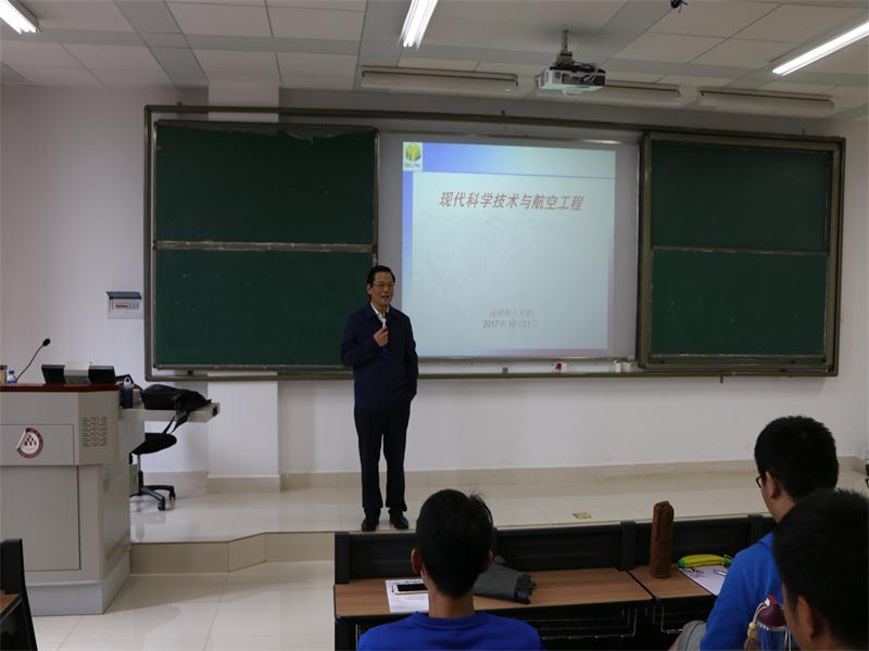 课堂上,易副校长用幽默诙谐的方式深入浅出地向同学们讲解了现代科学与技术的概念与特征,以历史的实例论证了科学就是知识体系的观点,从具体的实例中阐述了科学与技术之间的联系,并结合学院培养方案,重点对《现代科学技术与航空工程》进行了系统的讲解,帮助新生了解科学与技术对现代航空事业发展的重要作用,以及航空及航空工程的重要性。易副校长引经据典,言辞幽默犀利,全场气氛热烈,掌声不断。