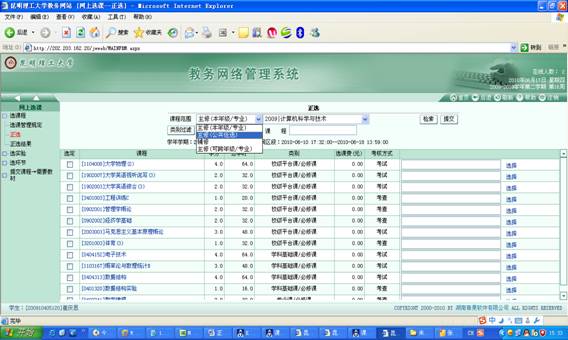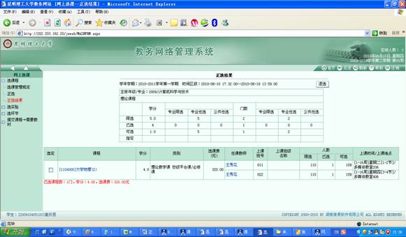 (3) 单击菜单项“网上选课→选课程→正选结果”,可以查询、退选已正选的课程,也可以查看本专业选课学分、门数限制。正选时超过上限系统会自动提示。(图2-3)。(注意:本次所选门数、学分及相应的选课费会在所选课程的下部以红色字体显示出来,其中在正选结果中无法选定退掉的课程是指定修读的课程)
