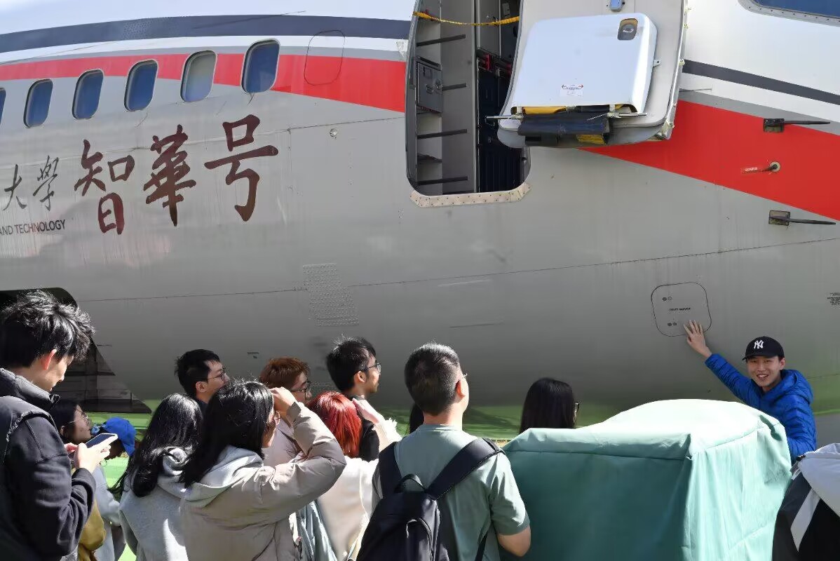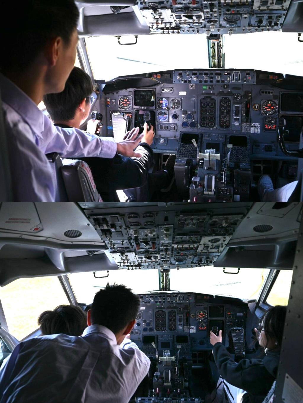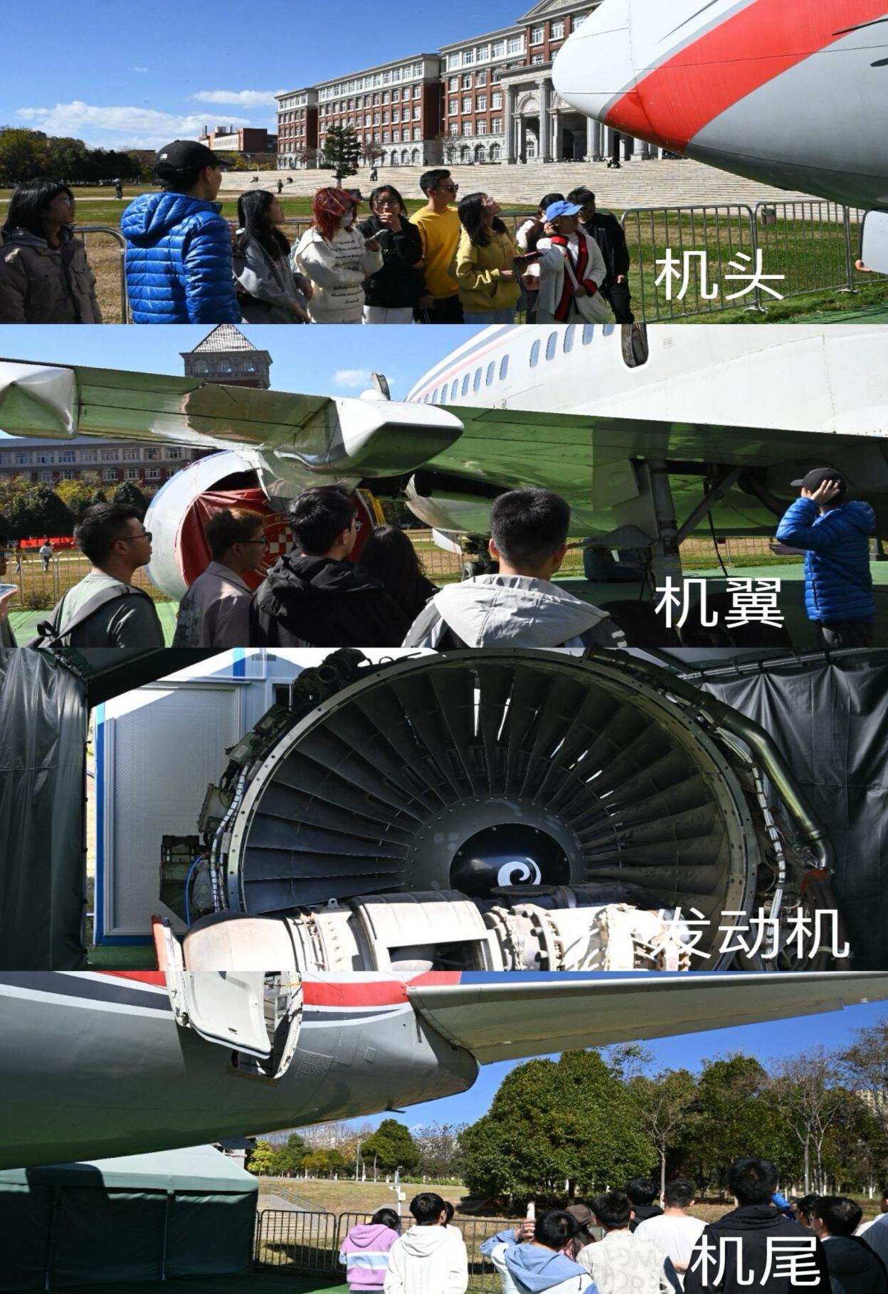 首先,我们由外到内、逐步深入的向同学们展示整架飞机的整体结构。由机头、机翼、发动机和机尾四个外观主要组成部分逐一讲解,将飞机整体外观更完全展示给同学们。紧接着,在了解到飞机整体轮廓后,我们对飞机进行了第一步深入体验,经过社团同学仔细讲解好构造以及安全注意事项后,让前来参观的同学有机会获得一次进入飞机的“肚子”——货舱的体验。最终来到同学们最期待的部分,走进大飞机内部,我们切身体会到了与乘坐飞机相比对于飞机内部更为细致的了解。携带好每个人登机牌我们出发万里长空。同学们机舱内依次等待,排队进入驾驶舱。面对复杂精密的操作设施,我们采取讲解配合实际操作的方式,让同学们在驾驶舱内拥有更直接的感受,我们的社团成员通过对不同零件功能的详细讲解,让同学们在最短时间内能够学会如何驾驶飞机。