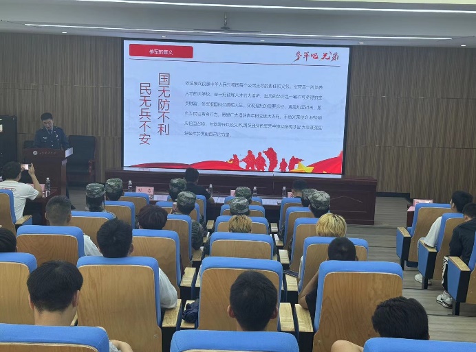 最后,武装部李绍川老师介绍大学生应征入伍政策,全面解读了国家、我省及学校关于入伍大学生的政策福利,详细阐述了国防建设对于国家的重要意义,讲解了应征入伍的条件以及应征入伍的报名流程,同时还讲到进入部队不仅能提升自身的身体素质,还能强化自身的各项能力,是一次很难得的机会,入伍后还会有各种优待政策、经济补贴、考研优势等政策。李老师李老师的动员深入浅出、条理清晰地阐述了入伍对于当代大学生的优惠之处,让在座的同学们能够深刻认识参军的重大意义,他鼓励同学们踊跃报名,积极咨询,希望同学们能用青春书写无愧于时代的热血篇章。