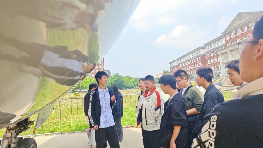 在“智华”科普基地的参观结束后,学子们来到学院波音737“智华号”飞机教学训练基地,与真实客机展开零距离接触。据介绍,这架型号为波音737-300的客机曾服役于民航运输航线,退役后经香港智华基金捐赠及学院采购,成为学院重要的教学实践资源,用于满足民用航空器维修人员执照培训等相关教学需求,助力CCAR147资质建设。在专业讲解员的带领下,同学们先围绕飞机进行顺时针环绕参观,详细了解了空速管、起落架、发动机、襟缝翼等外部关键部件的名称与功能,学习了各部件协同作用实现飞机安全起降的原理。