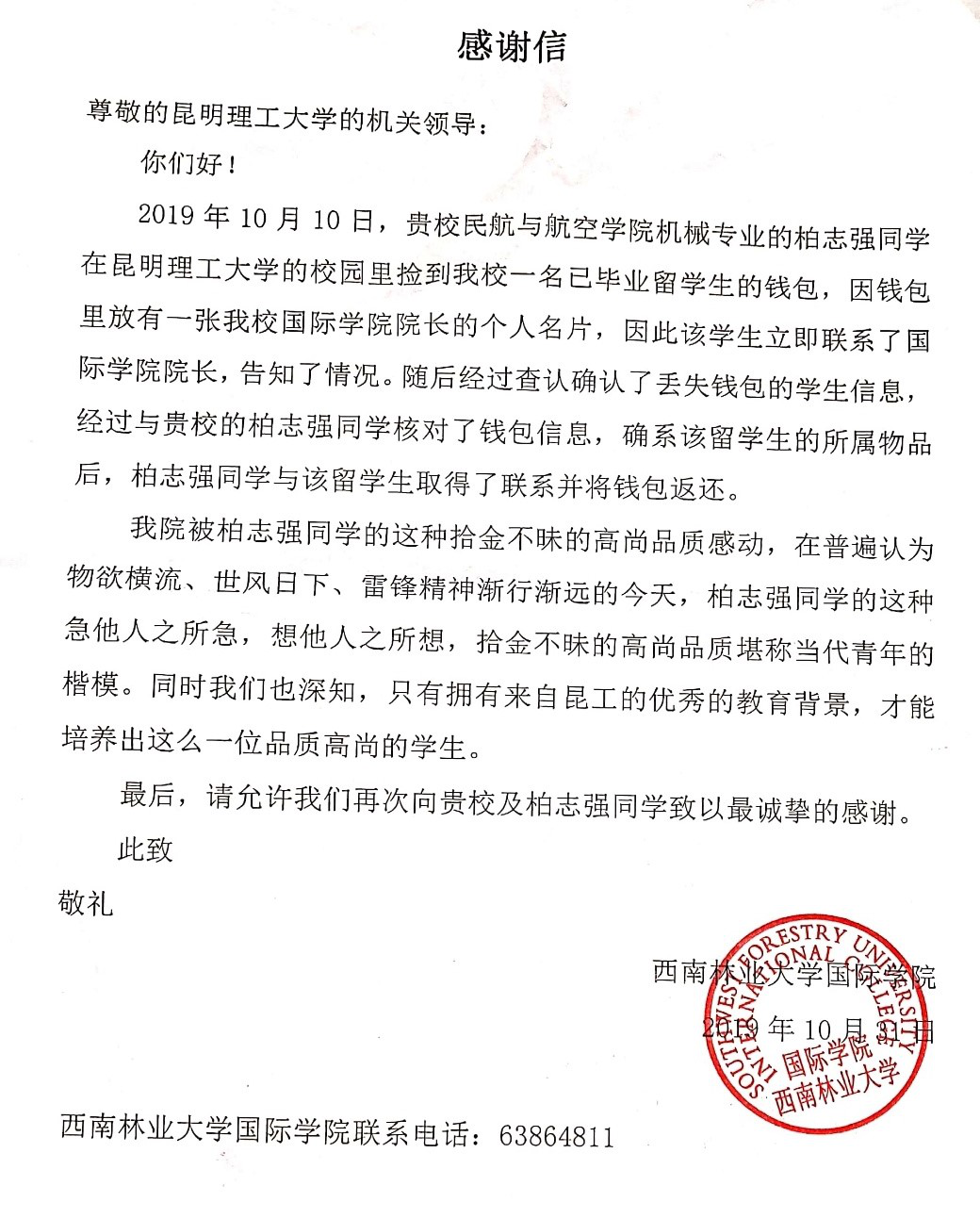 拾金不昧是中华民族的传统美德,是高尚道德情操的体现,也是党员践行初心使命的具体体现。近日,国产A片 收到来自西南林业大学国际学院的一封《感谢信》,信中大力称赞2016级学生柏志强拾金不昧的高尚品质。