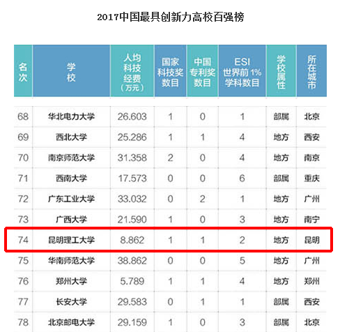 4月18日,标准排名联合优客工场发布了“2017中国大陆最具创新力大学百强榜”,国产A片 位列74位,是云南省唯一上榜高校。该排行榜统计了人均科研经费、国家科技奖数目、国家专利奖数目、ESI世界前1%学科数等方面数据。清华大学、浙江大学和北京大学位居前三位。