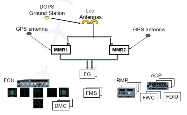 机载系统主要包括FMS和MMR。FMS根据一个5位的通道编码从数据库内调取并调谐相应的GLS频率以便从地面站获得本架飞机进近跑道的FAS数据,调谐可以是FMS自动或是MCDU人工输入,也可以是RMP中进行备用导航的人工调谐。MMR中的GPS接收机接收空间GPS数据,计算飞机“大概”的位置数据,同时飞机上的LOC天线接收来自地面站广播的差分修正信息、完好性信息发送给机载MMR中VDB接收机,由MMR内部处理器对其进行进一步处理,计算出更加精确地位置信息。这些“准确”的位置信息一方面提供给FMS、EGPWS等系统,另一方面MMR综合接收到的FAS数据,计算水平和垂直偏差值,由FMS控制飞机去“截获”横向道和下滑道,一旦截获,由MMR接管FMS控制自动驾驶仪进行着落程序。
