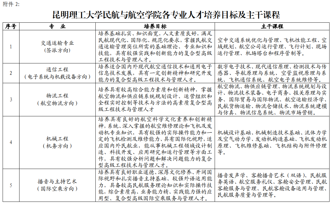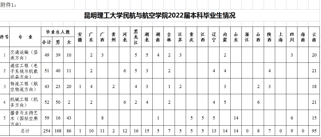 2022年,我院将有交通运输(签派方向)、通信工程(电子系统与机载设备方向)、物流工程(航空物流方向)、机械工程(机务方向)、播音与主持艺术(国际空乘方向)5个专业本科生毕业,预计250余人。生源、专业及男女生分布情况见附件1,各专业人才培养目标及主干课程见附件2。