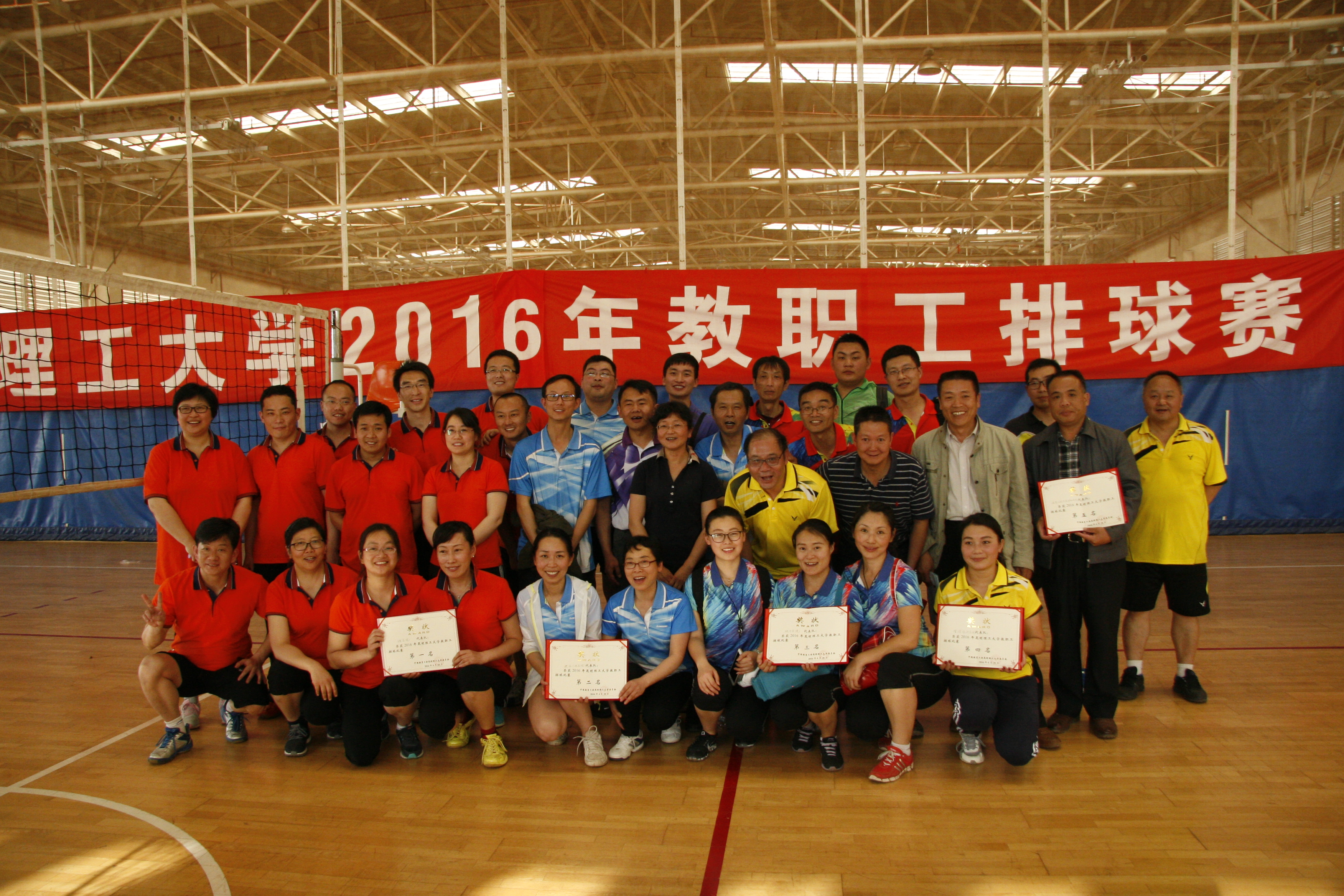 4月28日,我校2016年教职工排球赛在呈贡校区体育教学楼圆满落下帷幕。在为期9天的比赛中,经过小组循环赛、交叉淘汰赛和和决赛三轮角逐,理学院工会代表队获得第一名、建工学院工会代表队获得第二名,城市学院工会代表队获得第三名、管经学院工会代表队分别获得第四名,获得并列第五名的工会代表队分别是校机关、信息工程与自动化学院、化学工程学院、国土资源工程学院工会代表队,其余参赛队获得参赛奖。